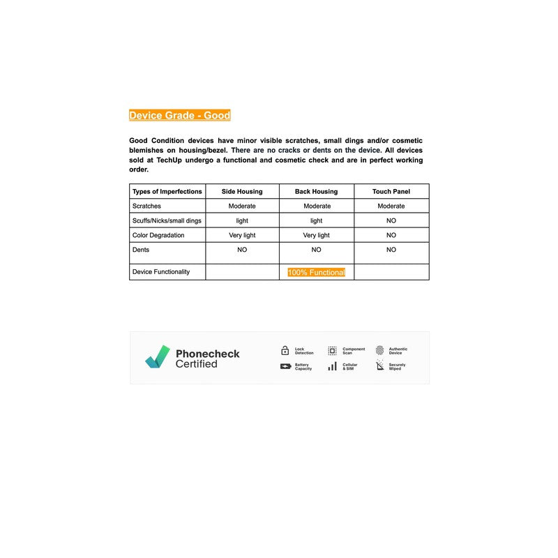 Every phone and tablet undergoes 40+ functionality checks via PhoneCheck diagnostic software. (Verification available on request.)