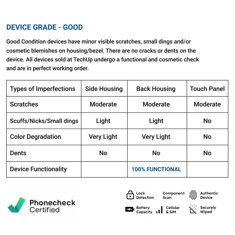 Every phone and tablet undergoes 40+ functionality checks via PhoneCheck diagnostic software. (Verification available on request.)