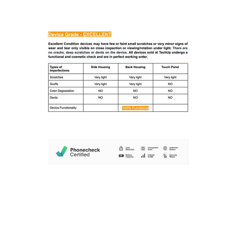 Every phone and tablet undergoes 40+ functionality checks via PhoneCheck diagnostic software. (Verification available on request.)