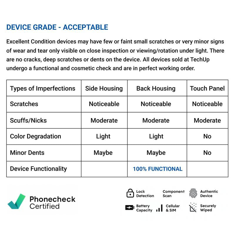 Every phone and tablet undergoes 40+ functionality checks via PhoneCheck diagnostic software. (Verification available on request.)
